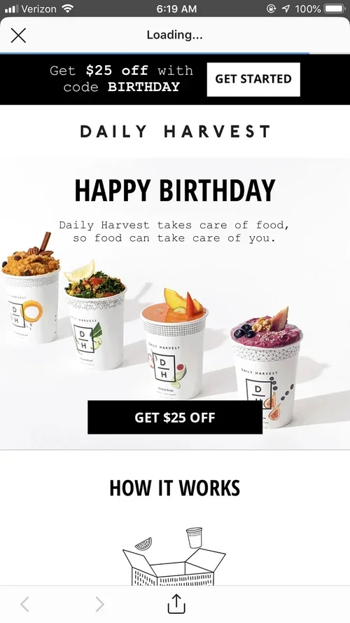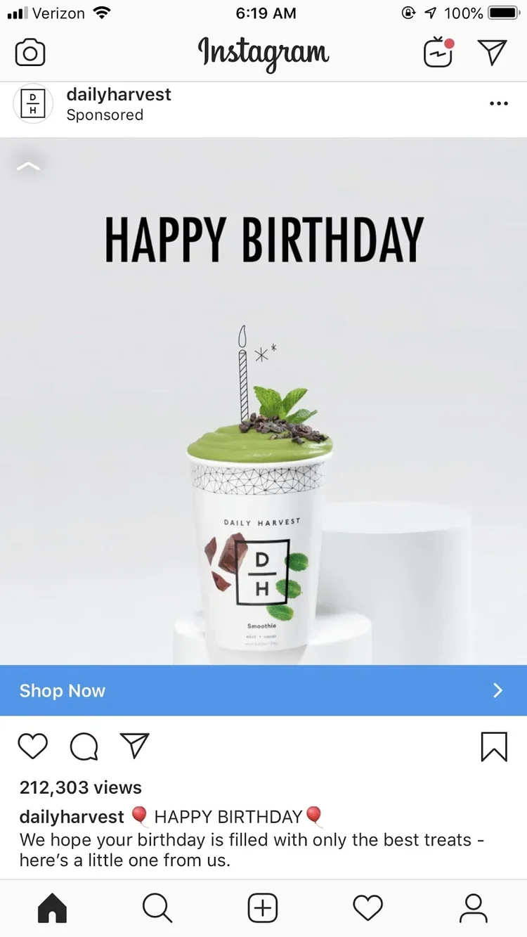 I’m pretty sure Daily Harvest purchased/used my birthday data point from Instagram to retarget me. When it’s a cute, clean, well-done ad and corresponding landing page like these (pretty sure the candle flame was slightly animated, too!) this digital marketer says, keep ‘em coming!